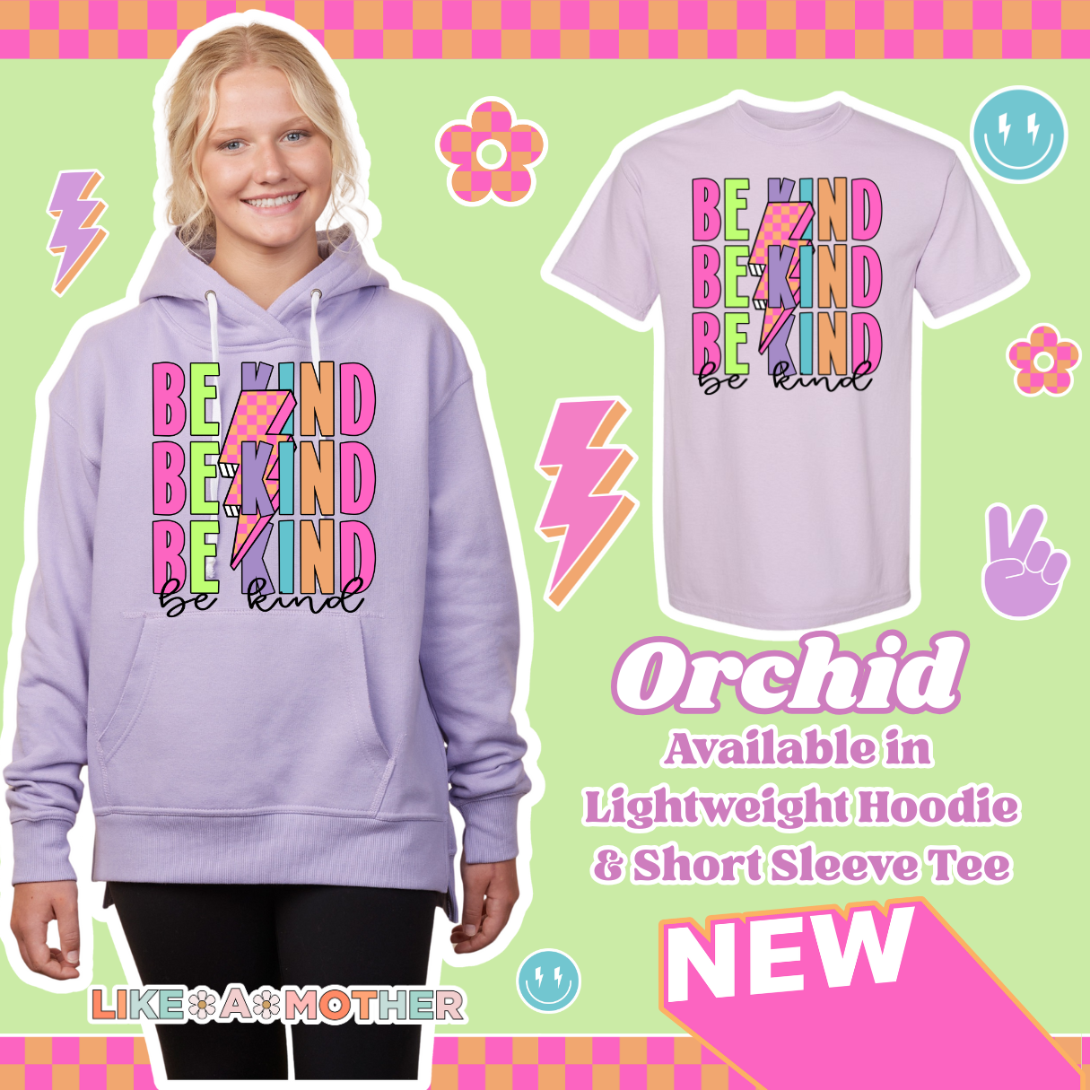 A little kindness goes a long way—and this one makes it cute. Our “Be Kind” design brings bright, retro vibes with bold color blocks and a lightning bolt for a fun reminder you can wear anywhere. Available in Orchid as a lightweight hoodie for cozy days or a classic tee for everyday wear.